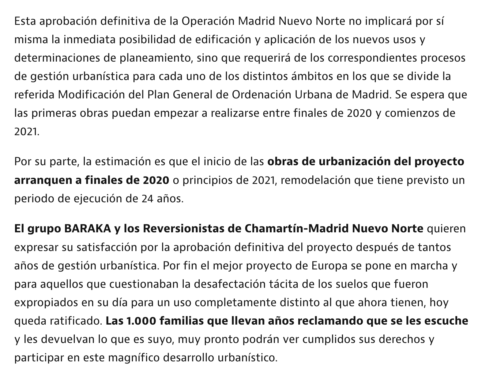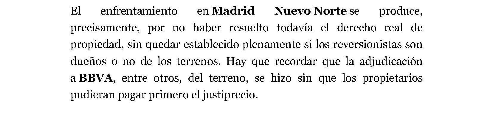 Me dirijo a todos Vds. para transmitirles nuestra firme decisión de continuar en la defensa de los derechos de reversión que de forma tan continua como injusta se han ignorado a lo largo de los casi ya treinta años que han transcurrido desde que se adjudicase la concesión de la conocida como “Operación Chamartín” – hoy “Madrid Nuevo Norte” – al Grupo liderado por ARGENTARIA – hoy BBVA –, cuya oferta fue seleccionada por ser la única que se hacía cargo del pago de aquellos derechos, y de los que la adjudicataria ha abonado únicamente los que titulaba la Compañía de Jesús, de evidente igual condición que los que pretenden arrebatarse a tantas familias aquí representadas.
