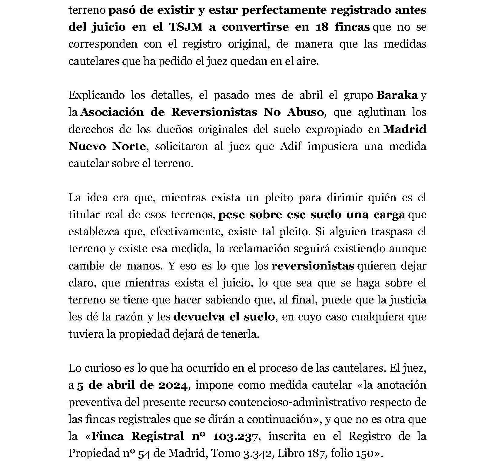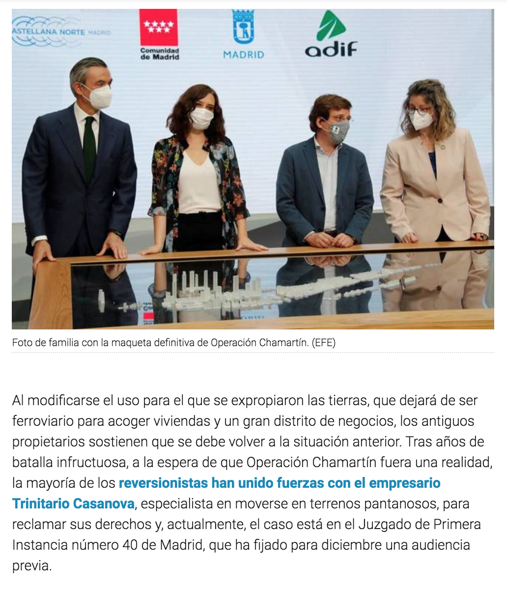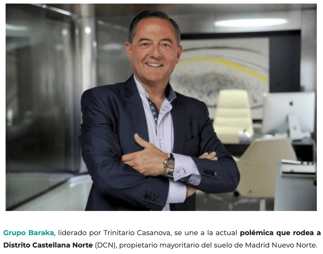 El empresario Trinitario Casanova vuelve a la carga y prepara nueva batalla legal en torno a Operación Chamartín. Grupo Baraka, propiedad de Casanova, trabaja en una demanda contra Adif por los derechos de reversión de parte del suelo sobre el que se levantará el megadesarrollo urbanístico, ahora conocido como Madrid Nuevo Norte.