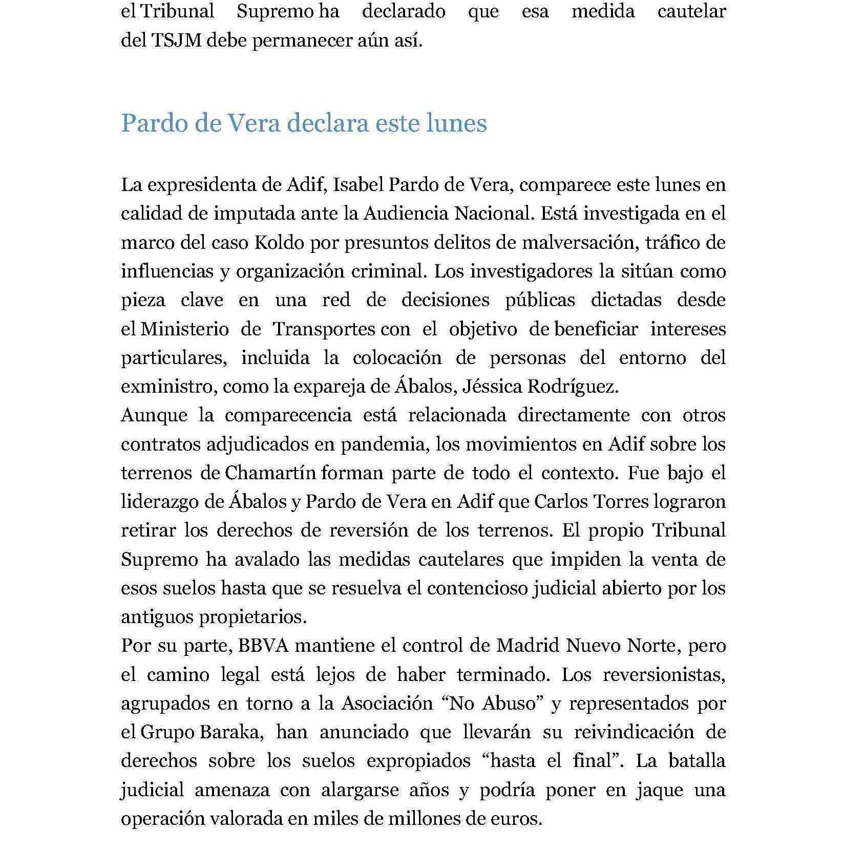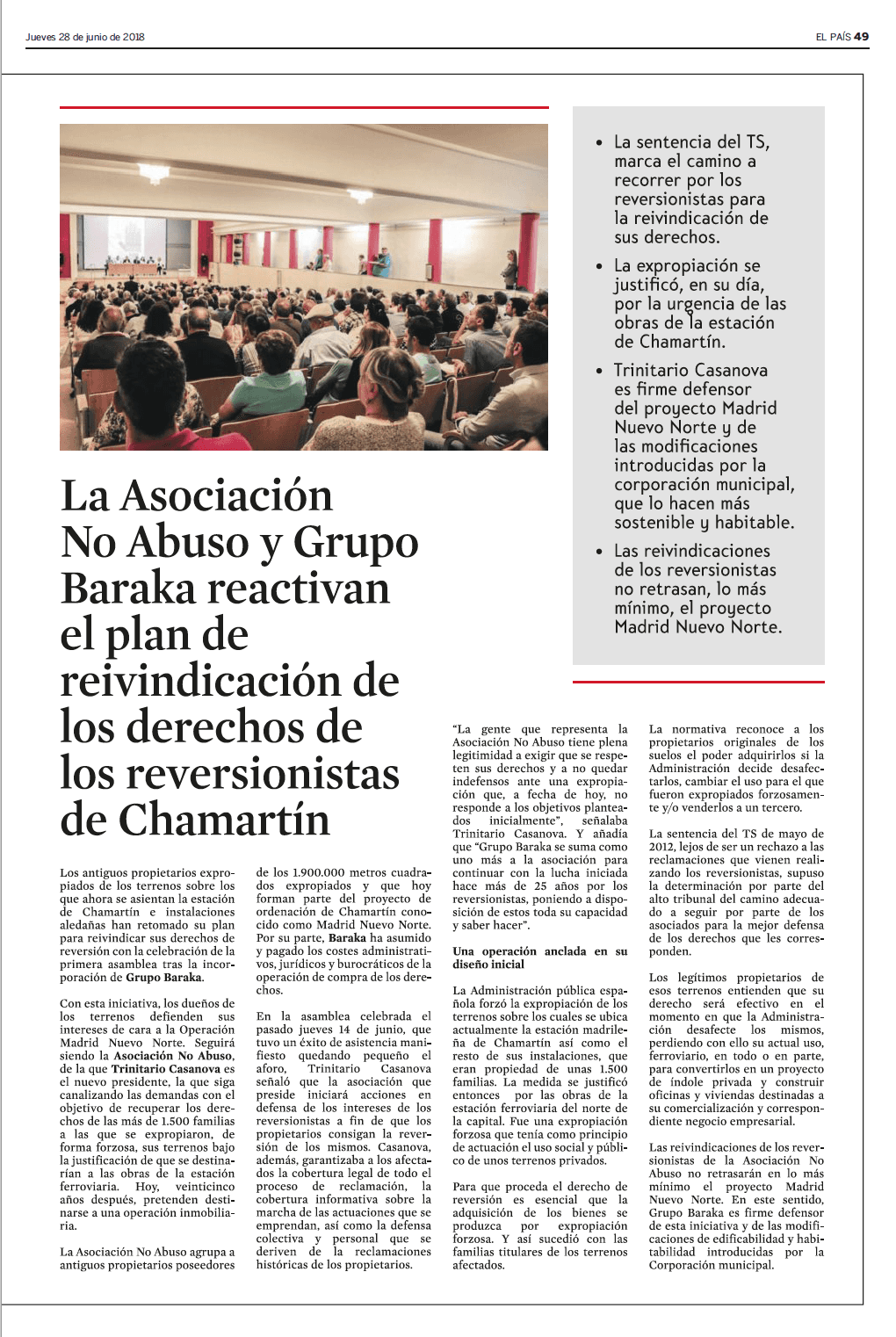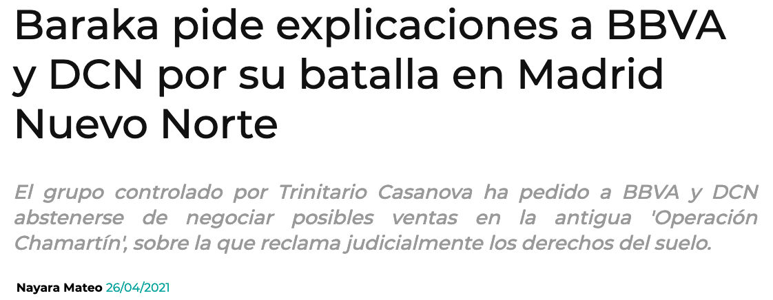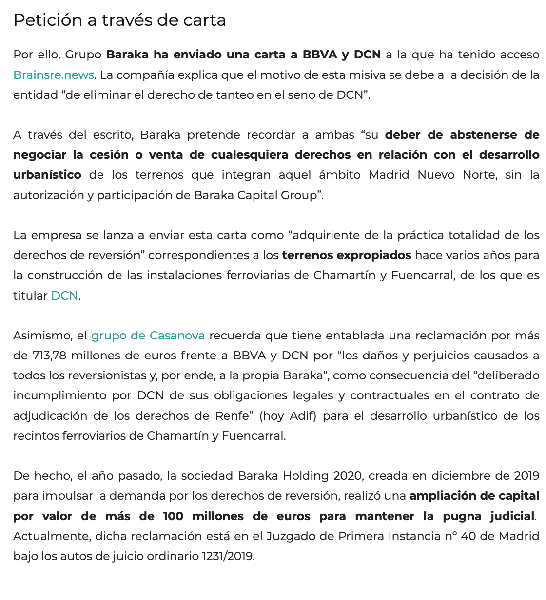 Mediante sentencia nº 125/2021 dictada por el Juzgado de 1ª Instancia nº 40 de Madrid, se desestima en primera instancia la demanda de juicio ordinario presentada por BARAKA como entidad titular de los derechos de reversión existentes sobre los antiguos recintos ferroviarios de Chamartín y Fuencarral en Madrid, frente a las mercantiles DISTRITO CASTELLANA NORTE, S.A. y BANCO BILBAO VIZCAYA ARGENTARIA, S.A.