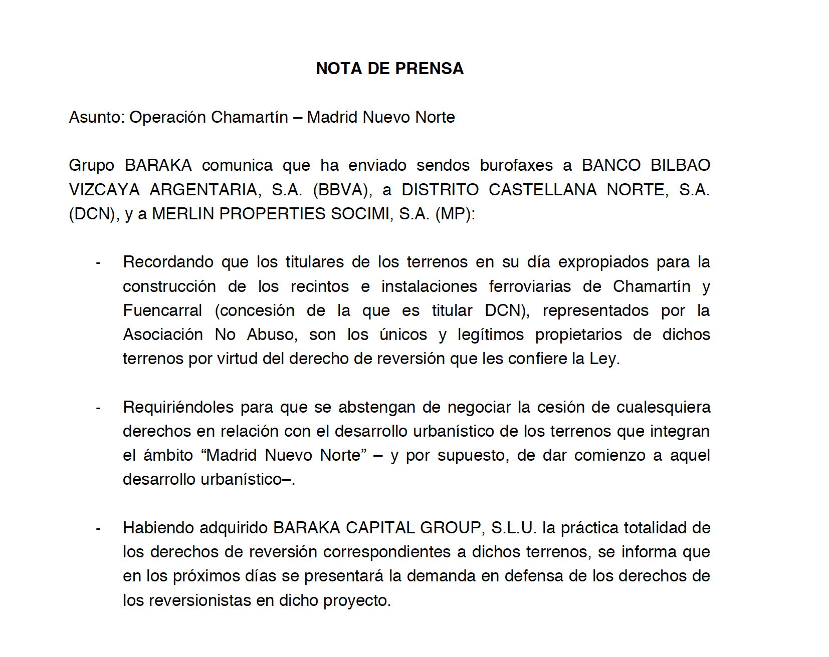 Baraka acordó en 2018 la compra de los derechos de reversión de los propietarios originales de más de un millón de metros cuadrados de suelo de Chamartín, que fueron expropiados hace más de 70 años, con un compromiso de inversión de 400 millones. El grupo ha desembolsado ya una "pequeña cantidad" de este pago. El resto se abonará una vez se materialice el derecho de reversión.