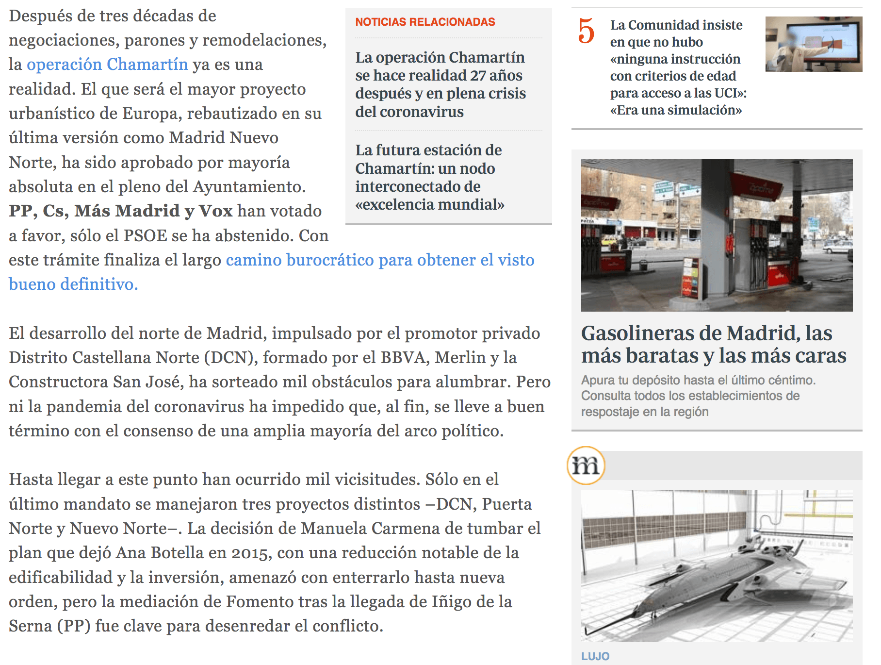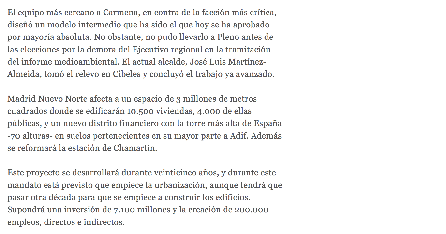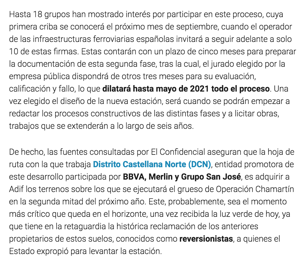 Estos suelos, propiedad ahora de Adif, son parte de los terrenos adjudicados en 1993 a Duch -empresa del grupo Argentaria, hoy integrada en BBVA-. CreaMNN, participada además de por BBVA por Merlin y Sanjosé, se convertirá en el principal propietario privado del proyecto una vez que ejecute la compra de los terrenos. Una operación prevista para los próximos meses. El importe a pagar por estos terrenos asciende a 984 millones y se financiará con una hipoteca a 20 años y un interés del 3%, lo que implica 261 millones adicionales. El primer pago será de 216 millones.