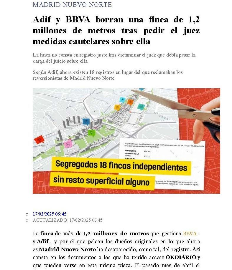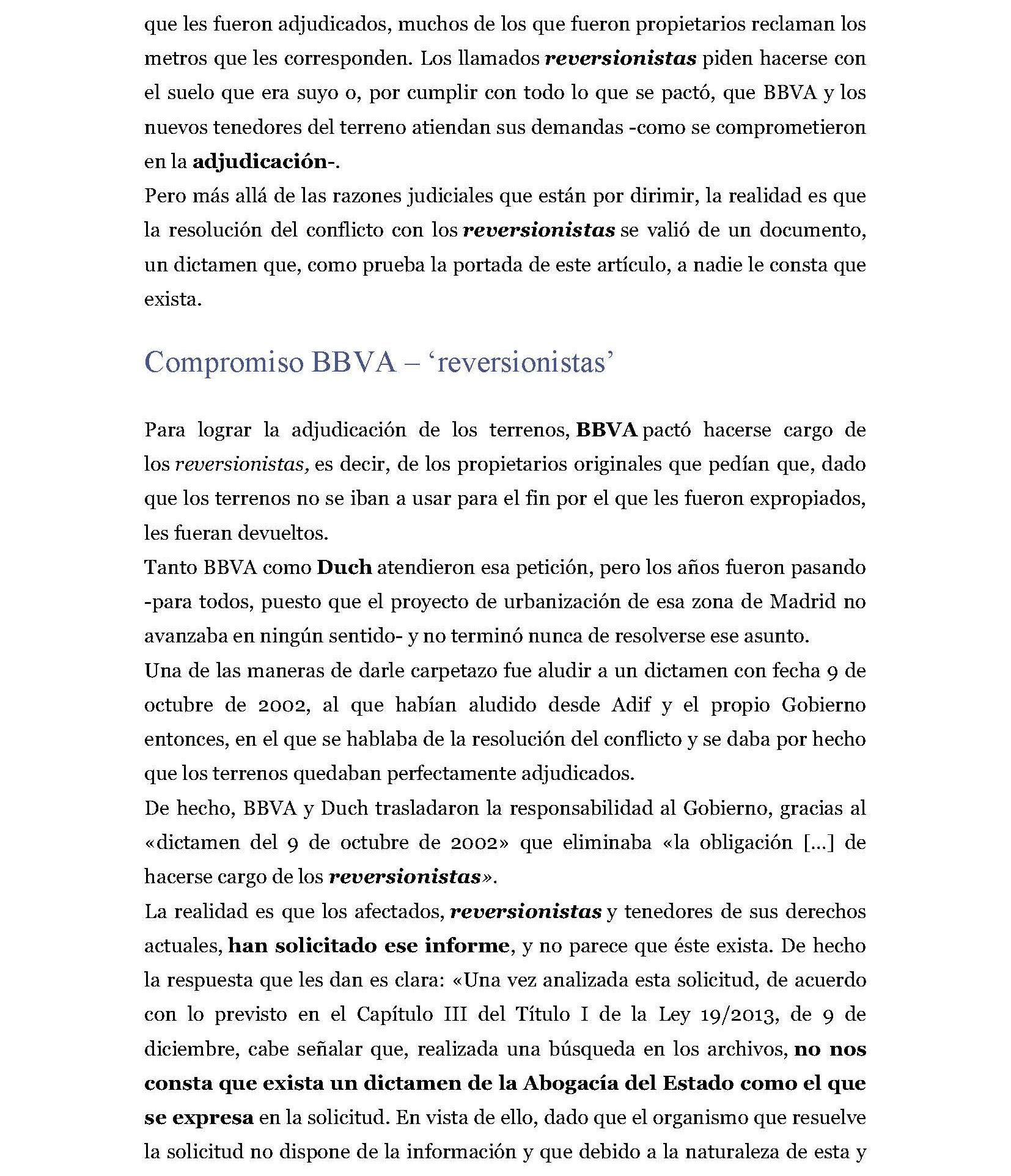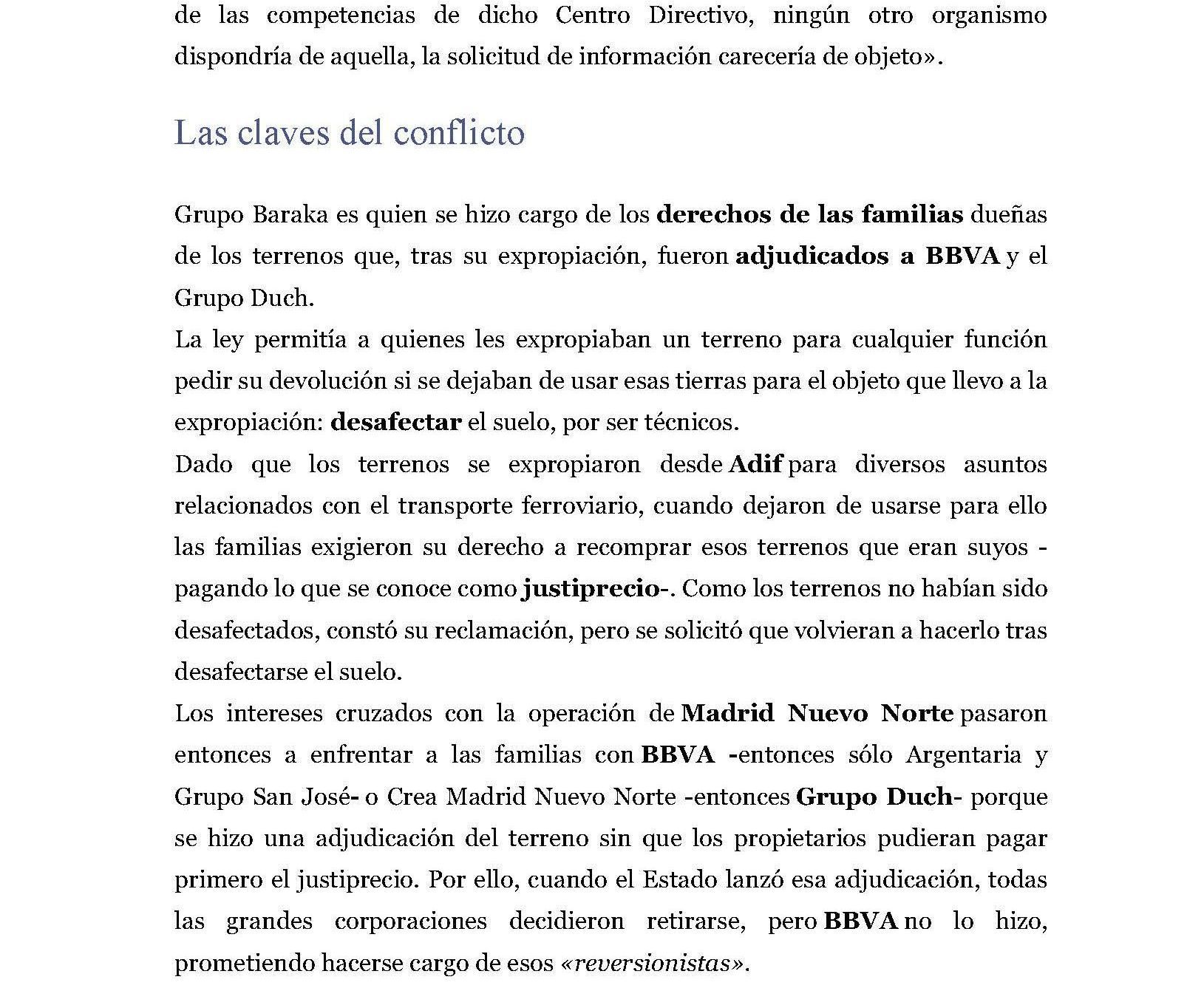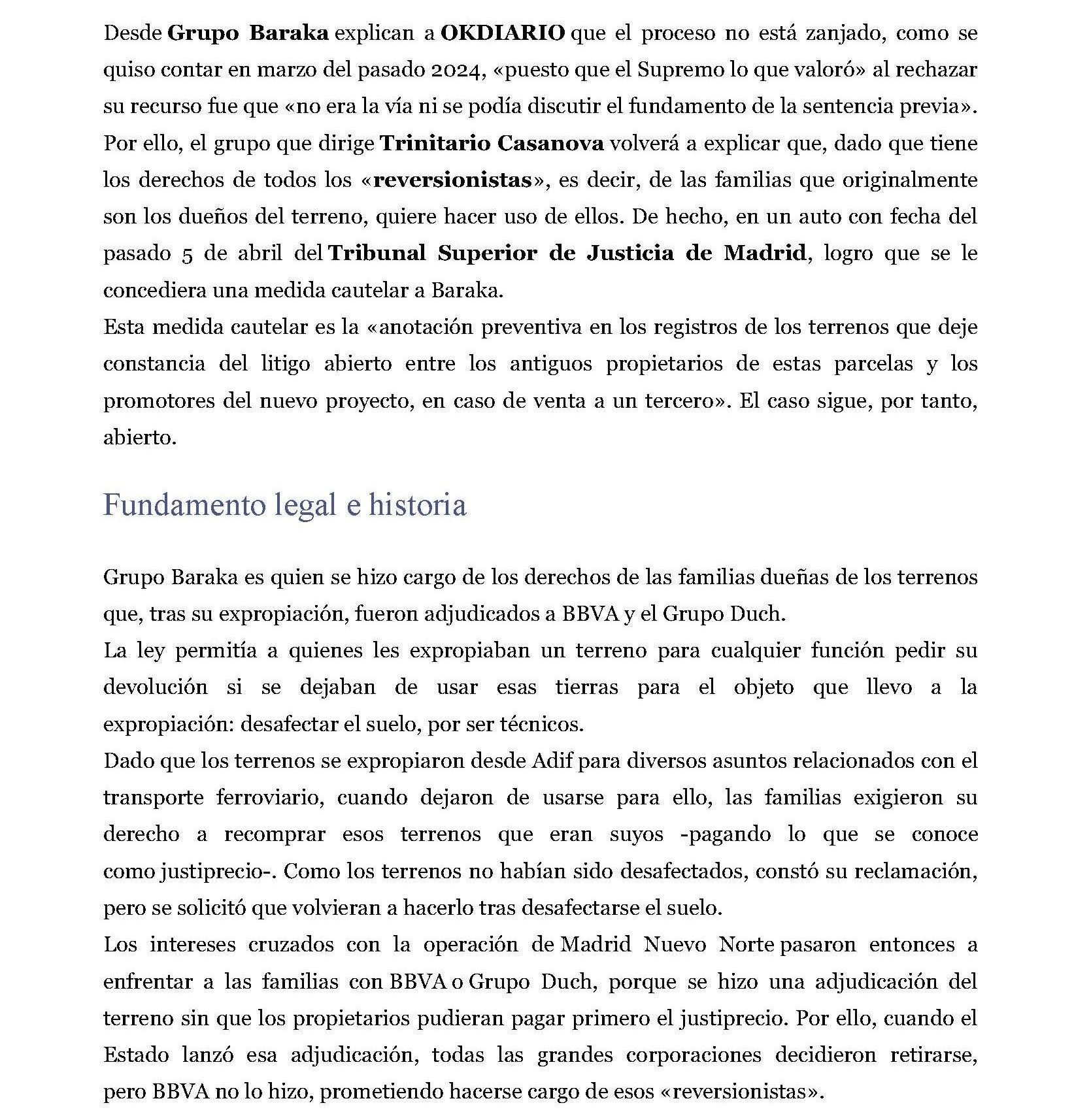 Por su parte, tanto la mercantil demandada BBVA, S.A., como su instrumental DISTRITO CASTELLANA NORTE, S.A., vienen manifestando en sus notas de prensa y en los distintos procedimientos judiciales seguidos hasta la fecha, que no existe la posibilidad de reconocer los derechos de reversión en este ámbito, confundiendo así la extemporaneidad de las acciones judiciales emprendidas en su día con la inviabilidad a futuro de estas mismas reclamaciones, lo cual, no habiendo sido declarado así por ningún Juzgado o Tribunal, ha venido constituyendo sin embargo su principal objetivo a los largo de estos 27 años transcurridos.